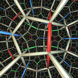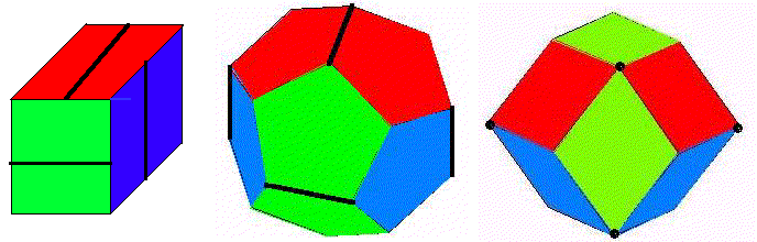 Borromean rings. By removing the rings we have a space homeomorphic to the complement of the rings.Now shrink the black edges in the dodecahedron to get a rhombic